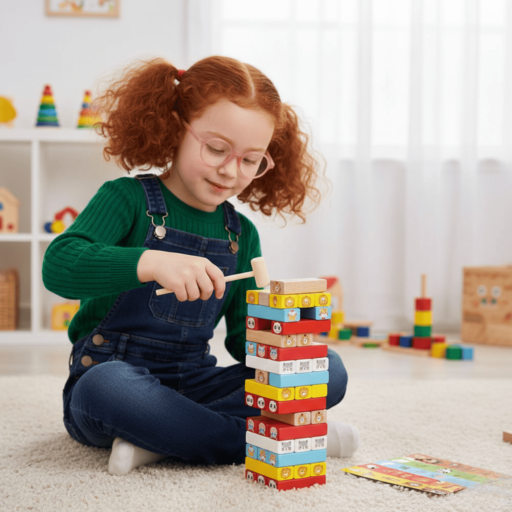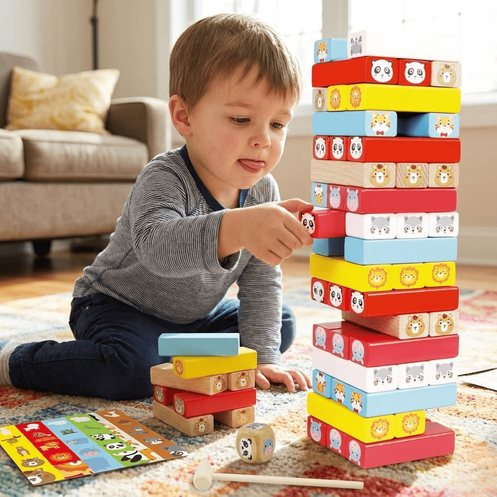 Щоб збудувати стійку конструкцію, дитина навчається зосереджуватися, діяти обережно та не поспішати. Гра розвиває посидючість і самоконтроль.