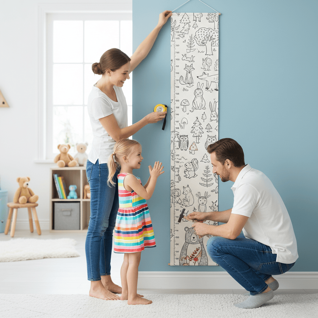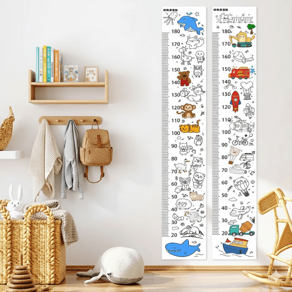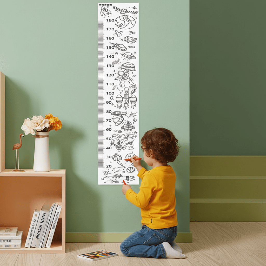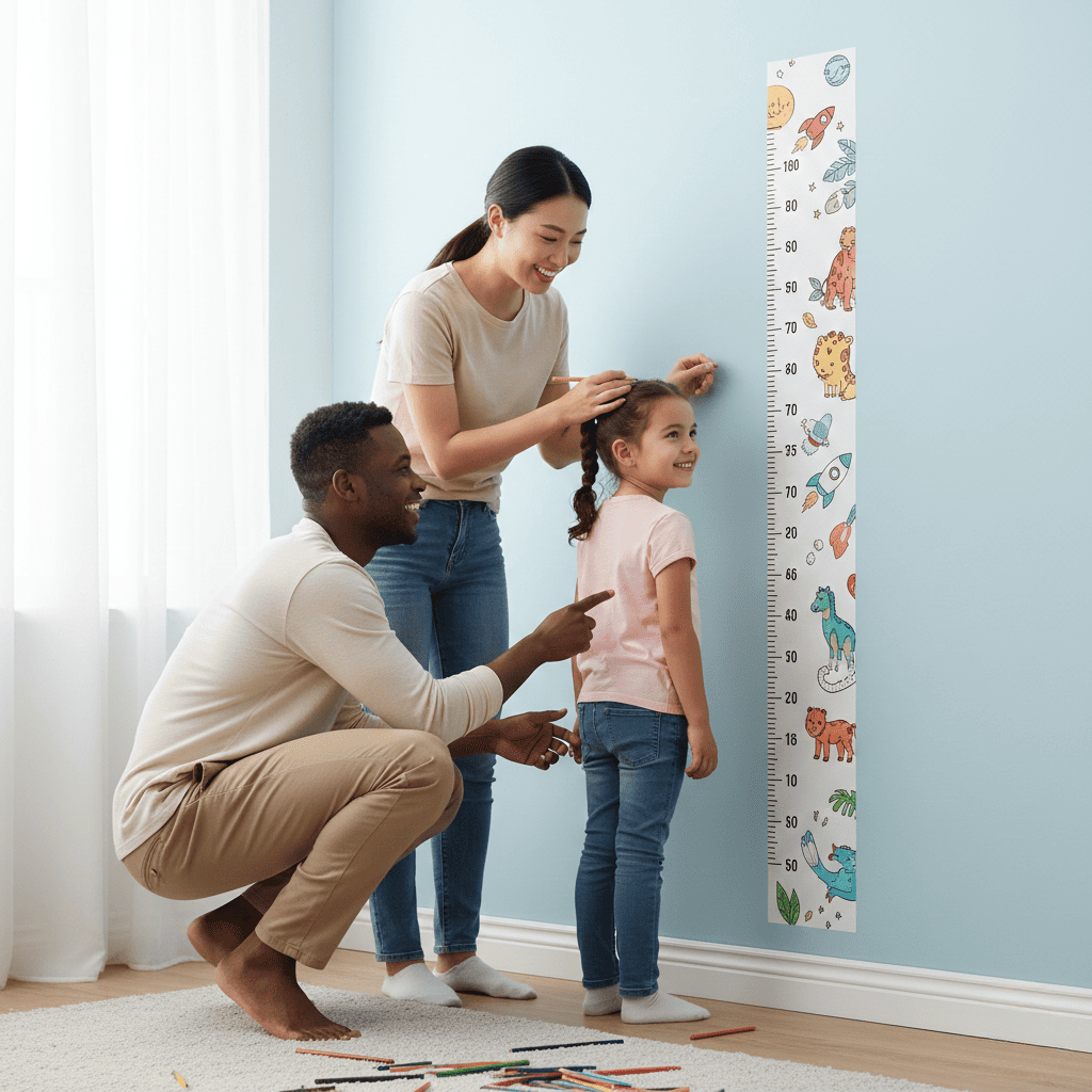 Кожна позначка на лінійці — це маленька сімейна подія. Наклейка дозволяє не просто вимірювати зріст, а фіксувати важливі етапи розвитку, створюючи живий щоденник дитинства прямо на стіні.