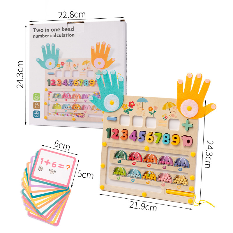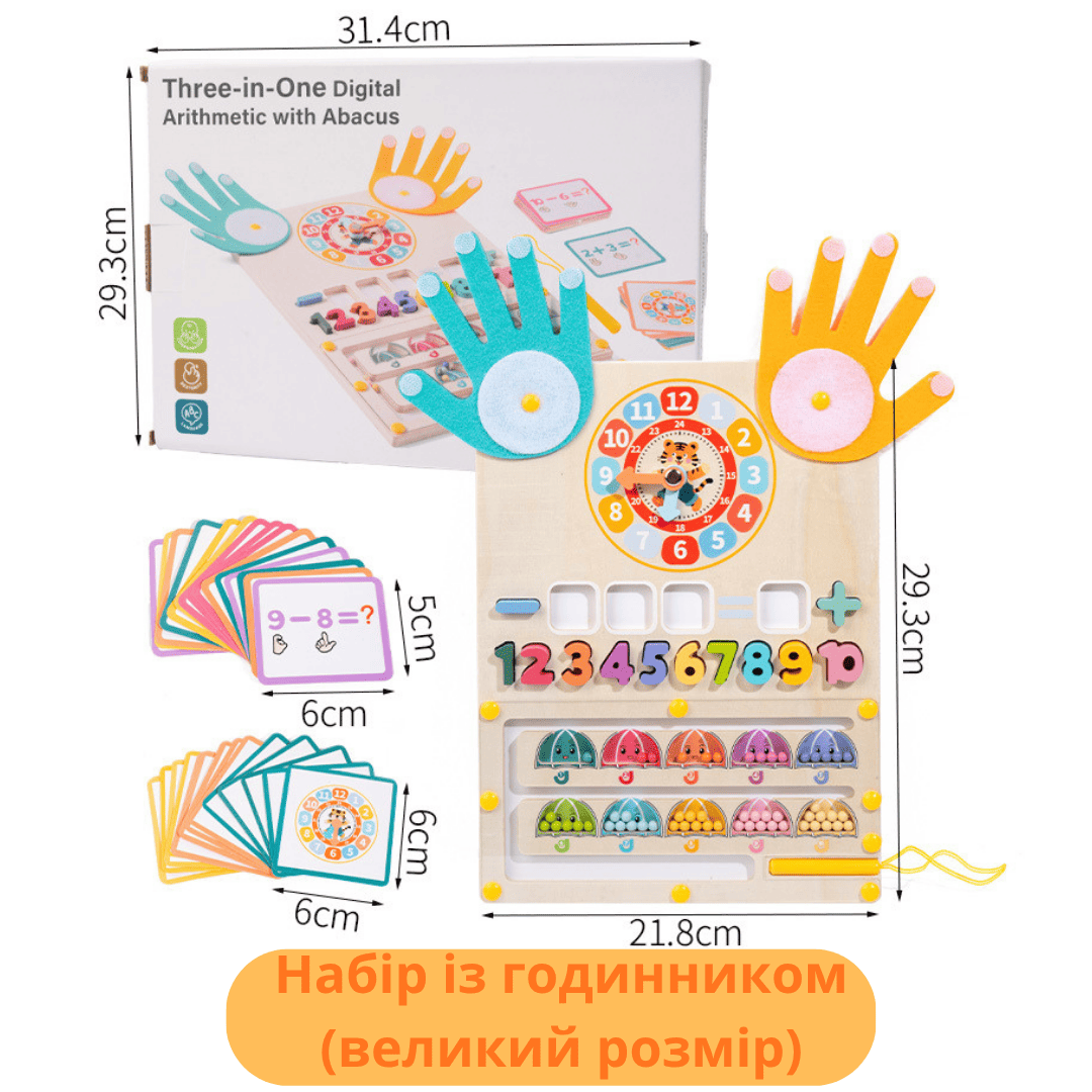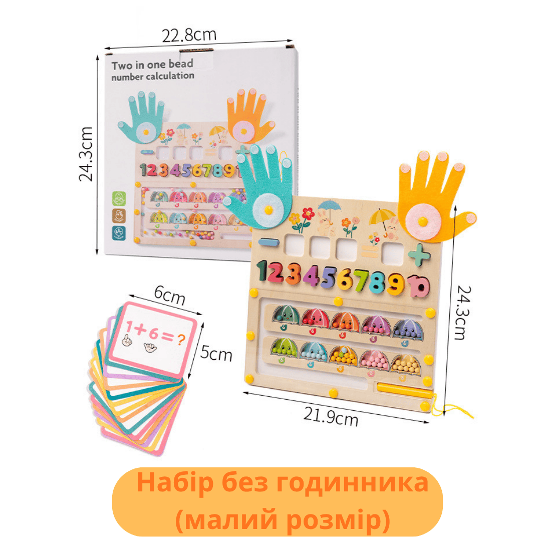- Дерев’яна ігрова панель, магнітна паличка, набір карток із прикладами, фетрові долоньки, вставні цифри.