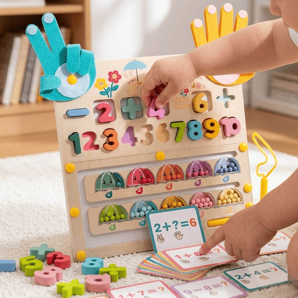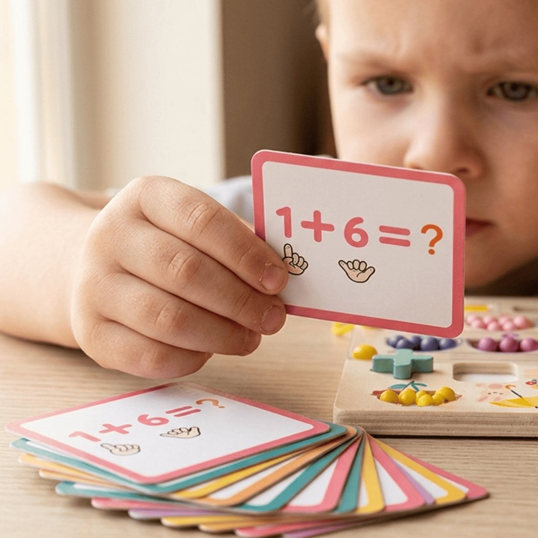 Завдяки спеціальним віконцям для прикладів і набору карток, дитина вчиться додавати та віднімати в ігровій формі. Вона не просто бачить приклад, а фізично розв’язує його, переміщуючи потрібну кількість кульок у кошики. Такий підхід розвиває логічне мислення та вчить самостійно перевіряти правильність своїх обчислень.