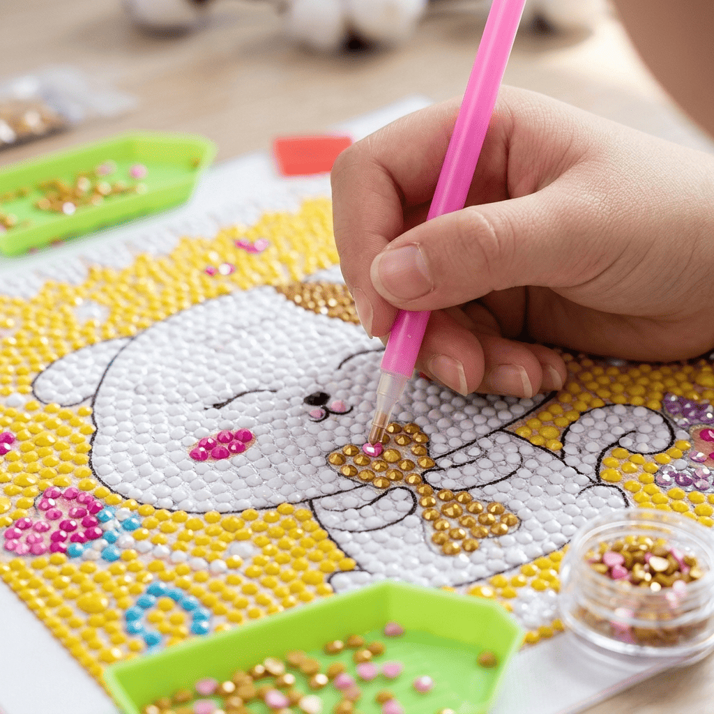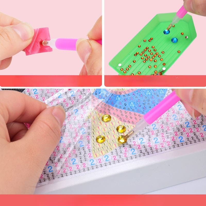До кожного набору входять аксесуари, що роблять процес створення картини максимально комфортним. Спеціальний стілус дозволяє легко підхоплювати стрази та точно переносити їх на полотно, а зручний лоток допомагає сортувати камінці за кольорами, запобігаючи їхньому змішуванню чи розсипанню.